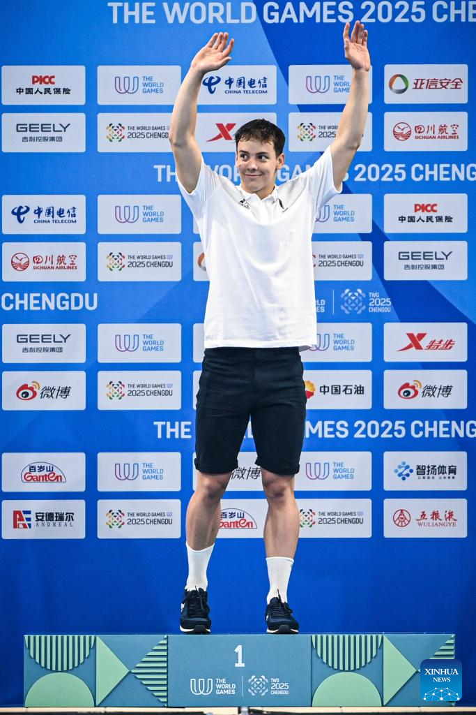 Gold medalist Tom Durager of France reacts during the victory ceremony for the men's 100m manikin carry with fins final match of Life Saving event at the World Games 2025 in Chengdu, southwest China's Sichuan Province, Aug. 8, 2025. (Xinhua/Jiang Han)