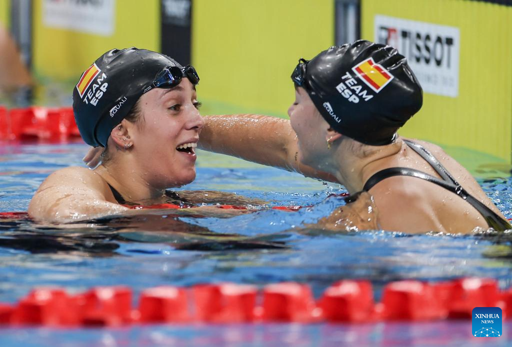 Antia Garcia Silva (L) of Spain hugs teammate Maria Rodriguez Sierra after the women's 100m manikin carry with fins final match of Life Saving event at the World Games 2025 in Chengdu, southwest China's Sichuan Province, Aug. 8, 2025. (Xinhua/Zhang Liyun)
