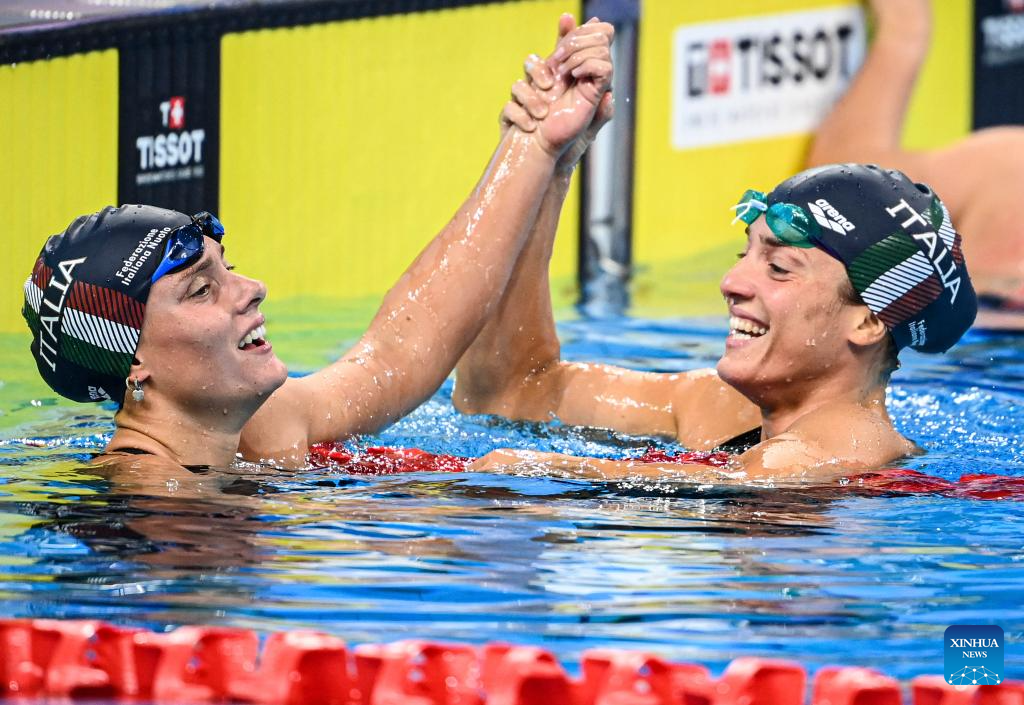 Lucrezia Fabretti (L) of Italy celebrates with teammate Federica Volpini after the women's 100m manikin carry with fins final match of Life Saving event at the World Games 2025 in Chengdu, southwest China's Sichuan Province, Aug. 8, 2025. (Xinhua/Jiang Han)