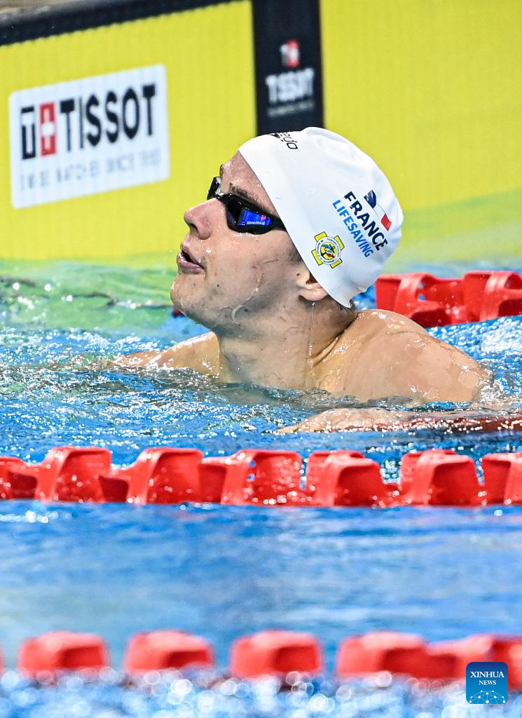 Tom Durager of France reacts after the men's 100m manikin carry with fins final match of Life Saving event at the World Games 2025 in Chengdu, southwest China's Sichuan Province, Aug. 8, 2025. (Xinhua/Jiang Han)