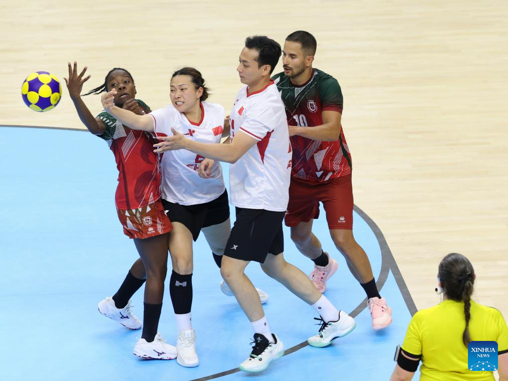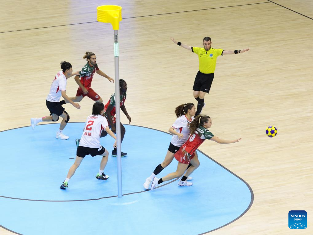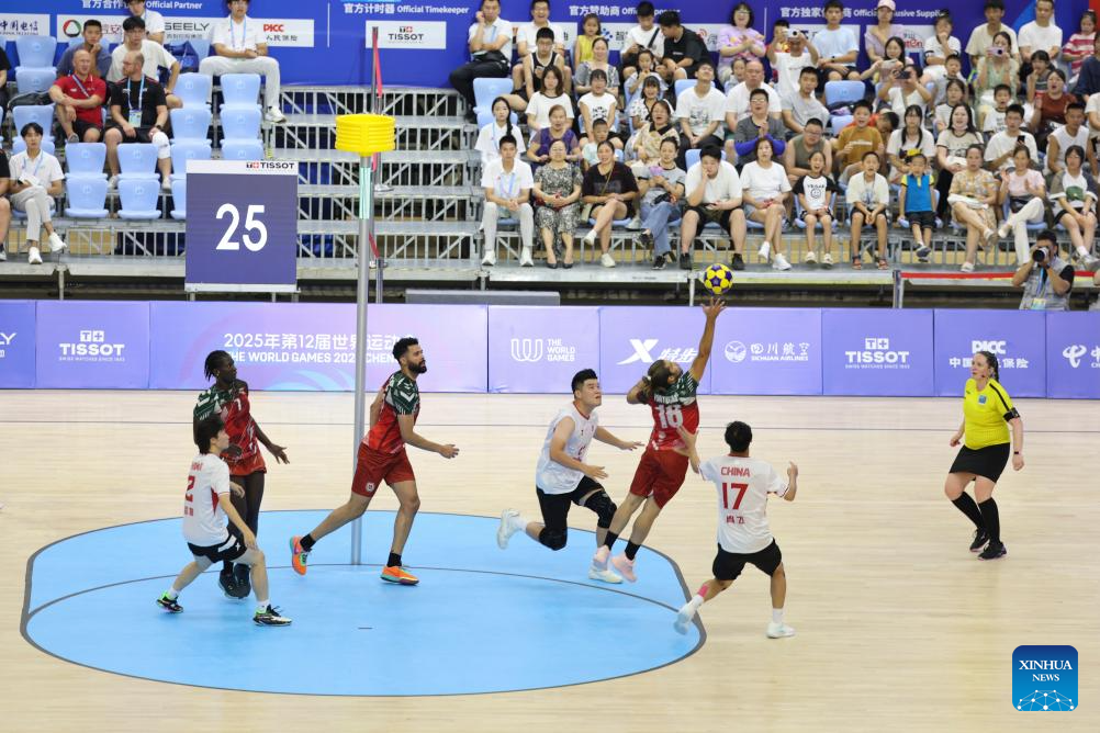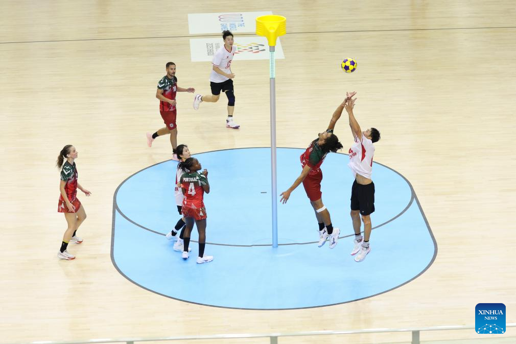 Players compete during the korfball mixed team preliminary round Group A match between China and Portugal at The World Games 2025 in Chengdu, southwest China's Sichuan Province, Aug. 9, 2025. (Xinhua/Jiang Kehong)