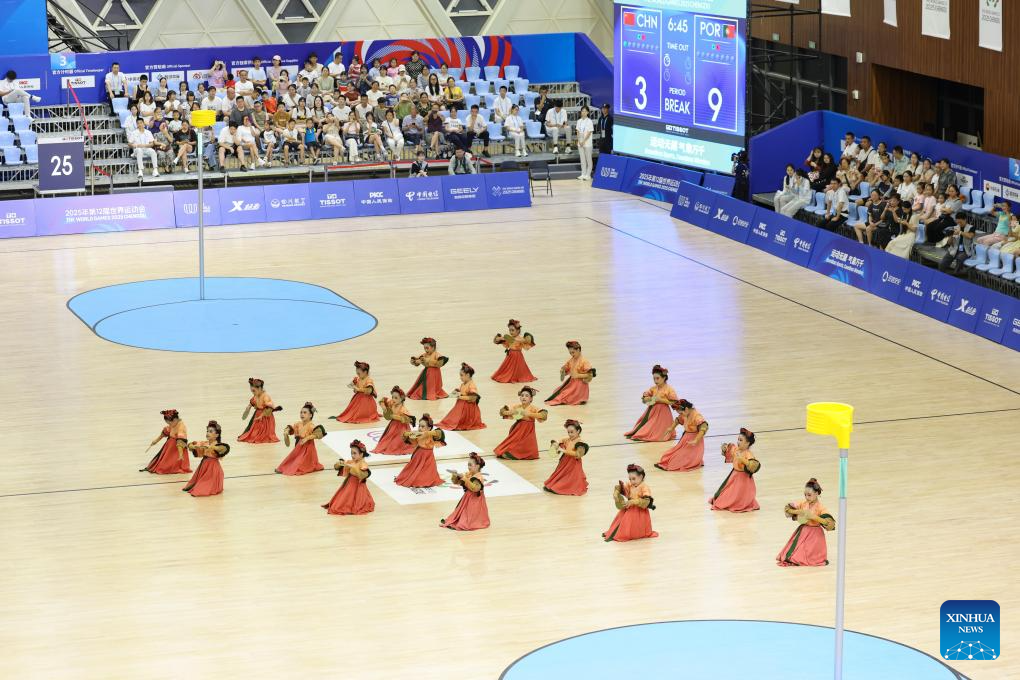 Children perform during the korfball mixed team preliminary round Group A match between China and Portugal at The World Games 2025 in Chengdu, southwest China's Sichuan Province, Aug. 9, 2025. (Xinhua/Jiang Kehong)