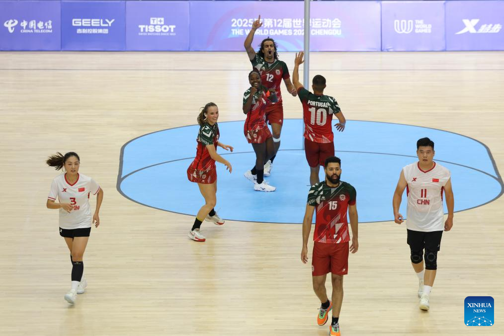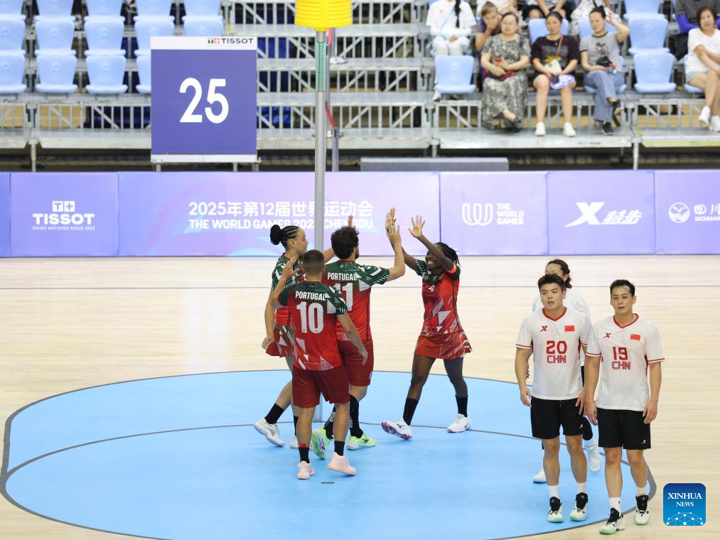 Players of Portugal (L) celebrate during the korfball mixed team preliminary round Group A match between China and Portugal at The World Games 2025 in Chengdu, southwest China's Sichuan Province, Aug. 9, 2025. (Xinhua/Jiang Kehong)