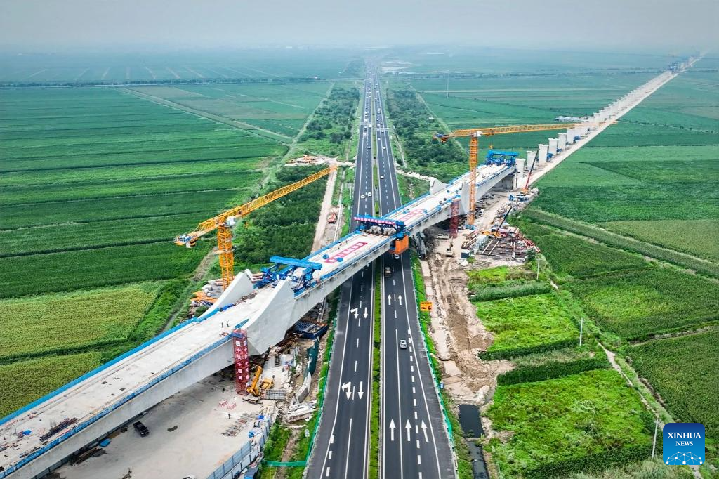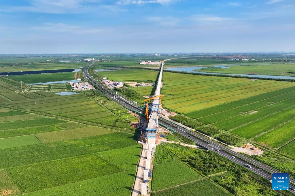 An aerial drone photo taken on Aug. 9, 2025 shows the newly closed continuous beam of Dongshou grand bridge, crossing over Rongcheng-Wuhai expressway, of Tianjin-Weifang high-speed railway, in Shouguang, east China's Shandong Province. Constructed by China Railway 14th Bureau Group Co., Ltd., the continuous beam boasts the longest span among its kind in the Shandong section of Tianjin-Weifang high-speed railway, with a main span of 168 meters. (Photo by Li Chunrui/Xinhua)