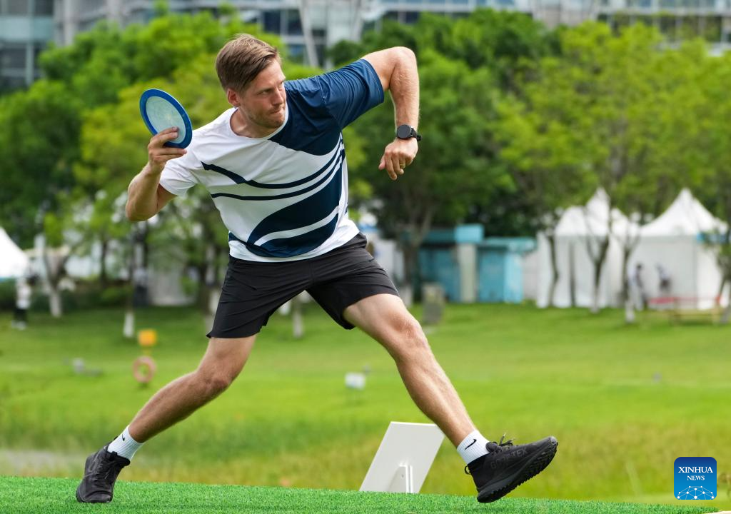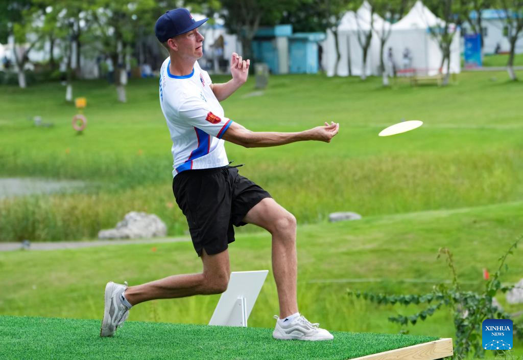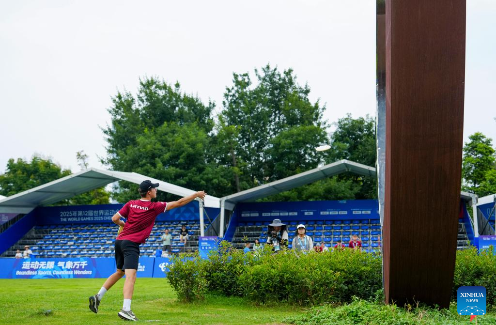 Rainers Balodis of Latvia competes during the mixed doubles semifinals of the Disc Golf event at The World Games 2025 in Chengdu, southwest China's Sichuan Province, Aug. 9, 2025. (Xinhua/Chen Xinbo)