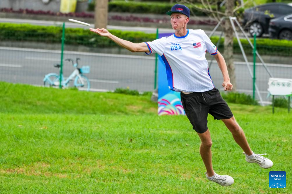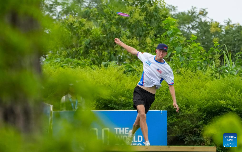 Gannon Buhr of the United States competes during the mixed doubles semifinals of the Disc Golf event at The World Games 2025 in Chengdu, southwest China's Sichuan Province, Aug. 9, 2025. (Xinhua/Chen Xinbo)