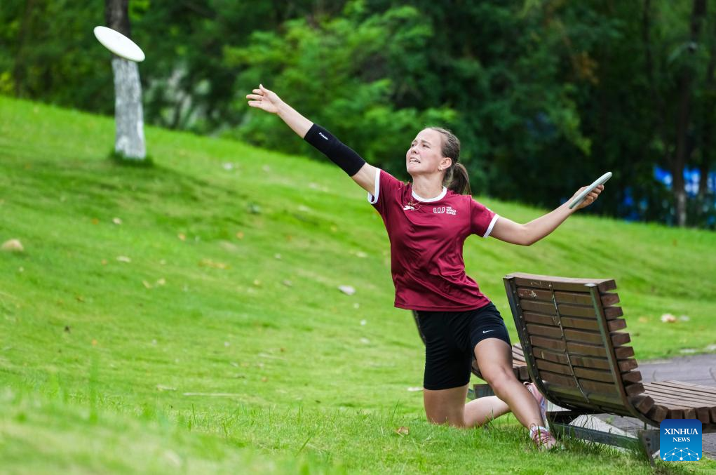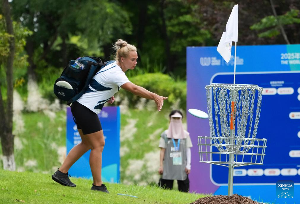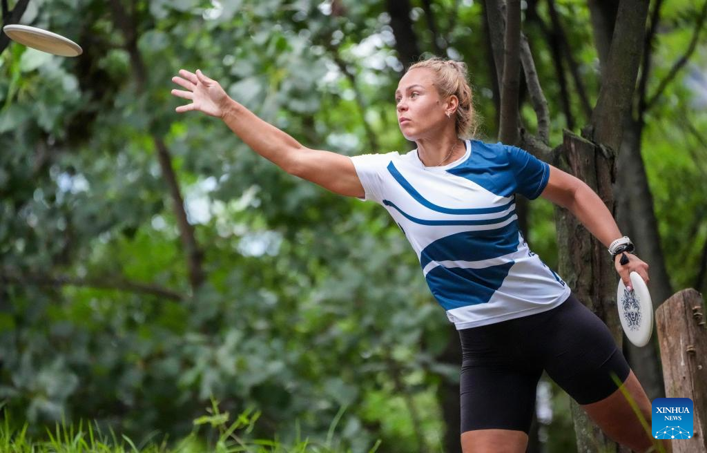 Kristin Latt of Estonia competes during the mixed doubles semifinals of the Disc Golf event at The World Games 2025 in Chengdu, southwest China's Sichuan Province, Aug. 9, 2025. (Xinhua/Chen Xinbo)