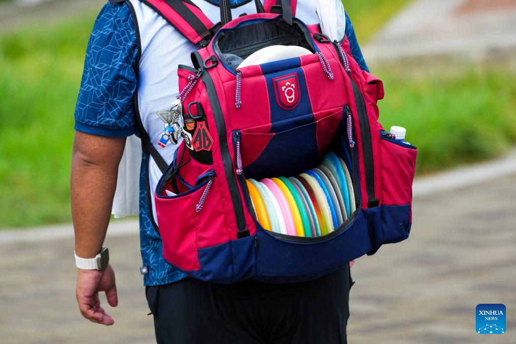 A backpack with discs inside is seen during the mixed doubles semifinals of the Disc Golf event at The World Games 2025 in Chengdu, southwest China's Sichuan Province, Aug. 9, 2025. (Xinhua/Chen Xinbo)