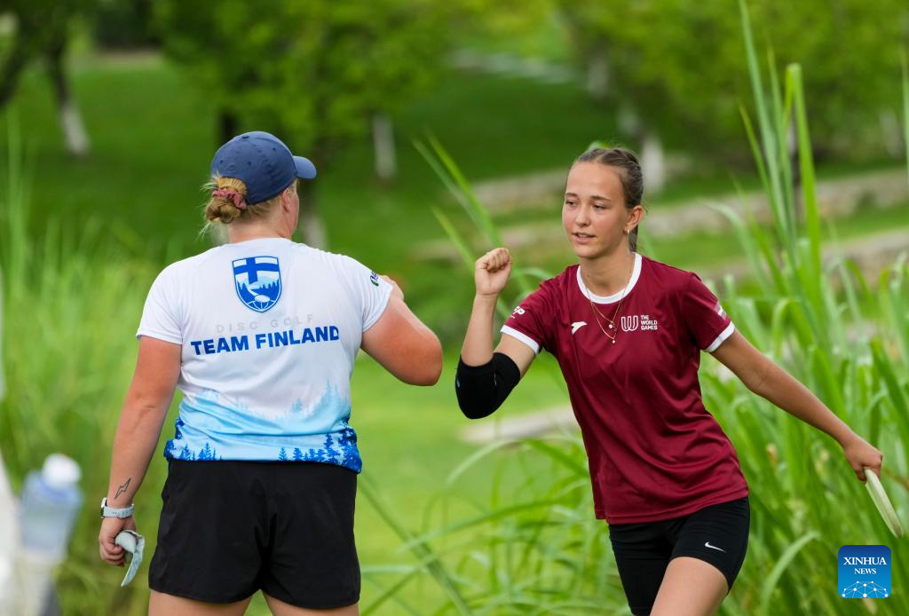 Elizabete Peksena (R) of Latvia greets Evelina Salonen of Finland after during the mixed doubles semifinals of the Disc Golf event at The World Games 2025 in Chengdu, southwest China's Sichuan Province, Aug. 9, 2025. (Xinhua/Chen Xinbo)