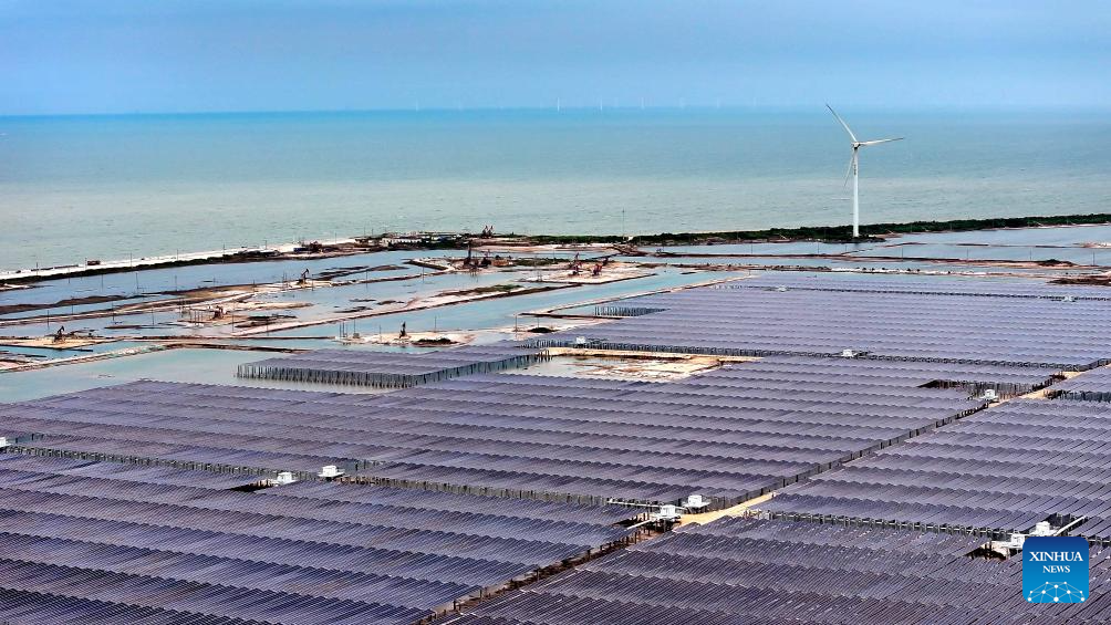 An aerial drone photo taken on Aug. 8, 2025 shows a demonstration project for integrated photovoltaic and energy storage in Dongying City, east China's Shandong Province. Dongying City has been actively developing clean energy in recent years. To make the best of idle land at Shengli Oilfield, a demonstration project for integrated photovoltaic and energy storage with a total installed capacity of 300 megawatts was accomplished in May 2025, seen to annually turn out 480 million kilowatt-hours of electricity. (Xinhua/Guo Xulei)