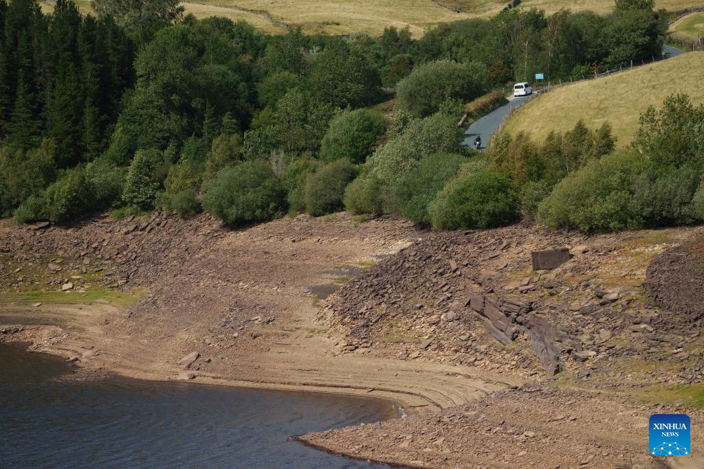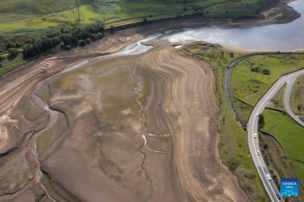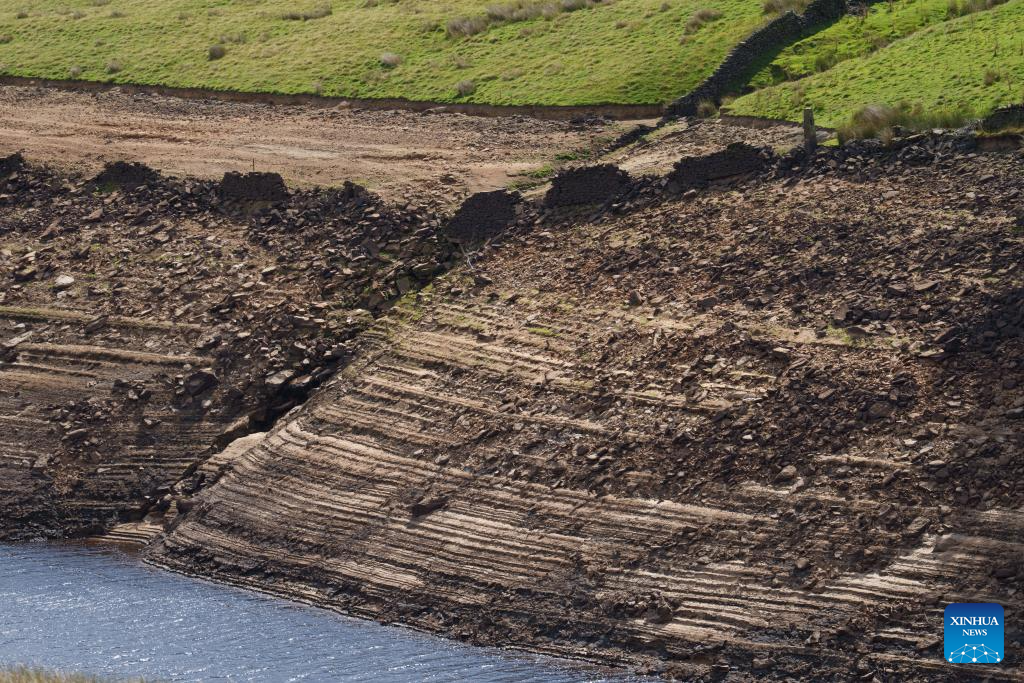 This photo taken on Aug. 8, 2025 shows a view of the Booth Wood Reservoir at a very low water level in Yorkshire, Britain. Reservoir levels recently have continued to fall as increased water use met lack of rain in Britain. (Photo by Jon Super/Xinhua)