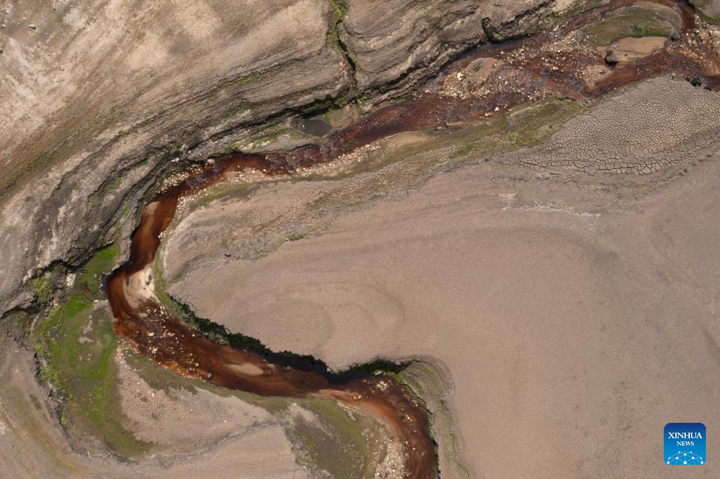 An aerial drone photo taken on Aug. 8, 2025 shows a view of the nearly exhausted Baitings Reservoir in Yorkshire, Britain. Reservoir levels recently have continued to fall as increased water use met lack of rain in Britain. (Photo by Jon Super/Xinhua)