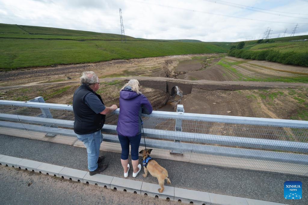People look at nearly exhausted Baitings Reservoir in Yorkshire, Britain, on Aug. 8, 2025. Reservoir levels recently have continued to fall as increased water use met lack of rain in Britain. (Photo by Jon Super/Xinhua)