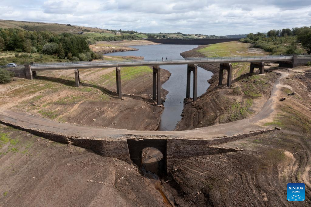 This photo taken on Aug. 8, 2025 shows a view of the Digley Reservoir at a very low water level in Yorkshire, Britain. Reservoir levels recently have continued to fall as increased water use met lack of rain in Britain. (Photo by Jon Super/Xinhua)