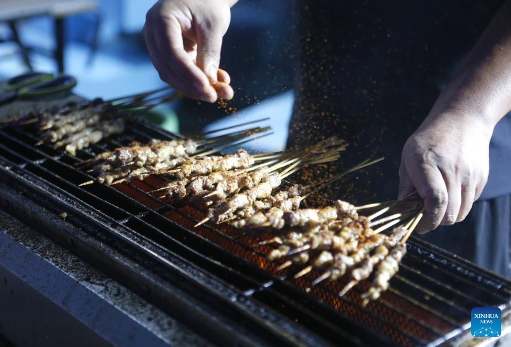 A vendor grills skewers at a pedestrian street in Laixi City, east China's Shandong Province, Aug. 8, 2025. In recent years, authorities of Laixi City have been hosting themed culture and tourism activities such as city basketball leagues and beer festivals to enrich the nightlife for both residents and tourists. (Xinhua/Ding Hongfa)