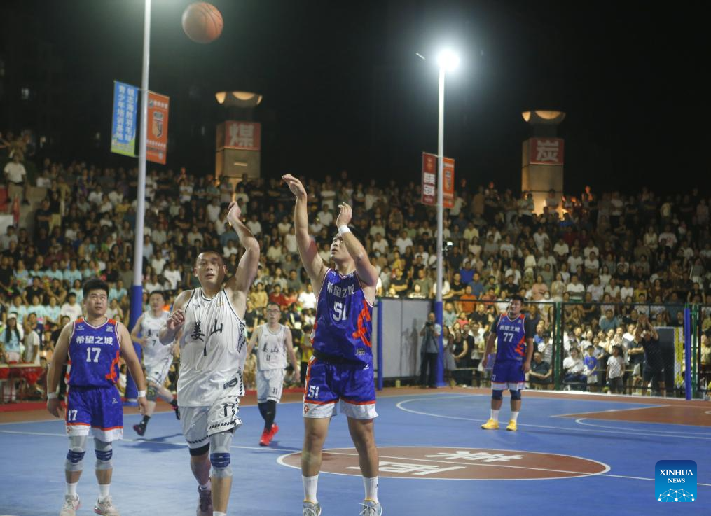 This photo taken on Aug. 8, 2025 shows a scene during a basketball league match in Laixi City, east China's Shandong Province. In recent years, authorities of Laixi City have been hosting themed culture and tourism activities such as city basketball leagues and beer festivals to enrich the nightlife for both residents and tourists. (Xinhua/Ding Hongfa)