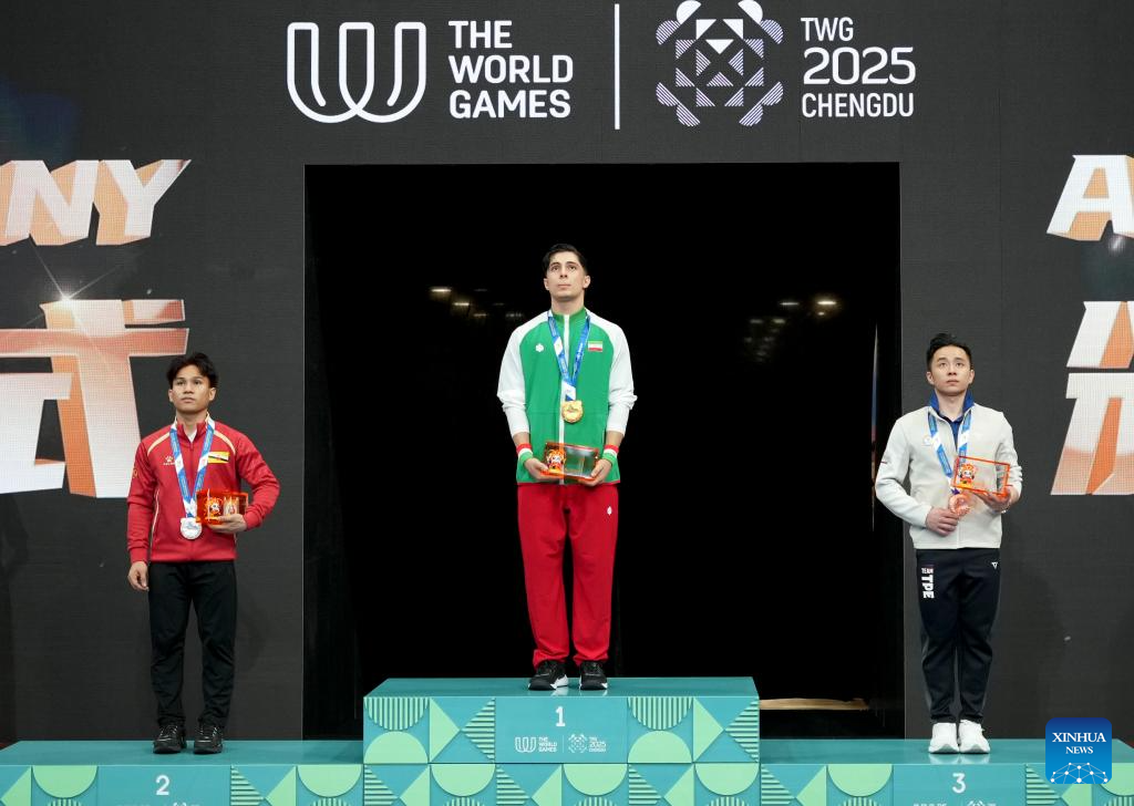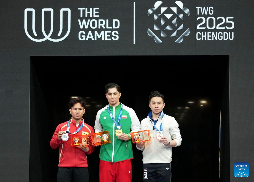 Gold medalist Shahin Banitalebi (C) of Iran, silver medalist Mohammad Adi Salihin Bin Roslan (L) of Brunei and bronze medalist Liu Chang Min of Chinese Taipei are seen during the awarding ceremony for the men's Nanquan-Nangun final of Wushu event at the World Games 2025 in Chengdu, southwest China's Sichuan Province, Aug. 8, 2025. (Xinhua/Xu Suhui)