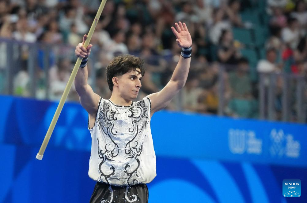 Shahin Banitalebi of Iran greets the spectators after the men's Nanquan-Nangun final of Wushu event at the World Games 2025 in Chengdu, southwest China's Sichuan Province, Aug. 8, 2025. (Xinhua/Xu Suhui)