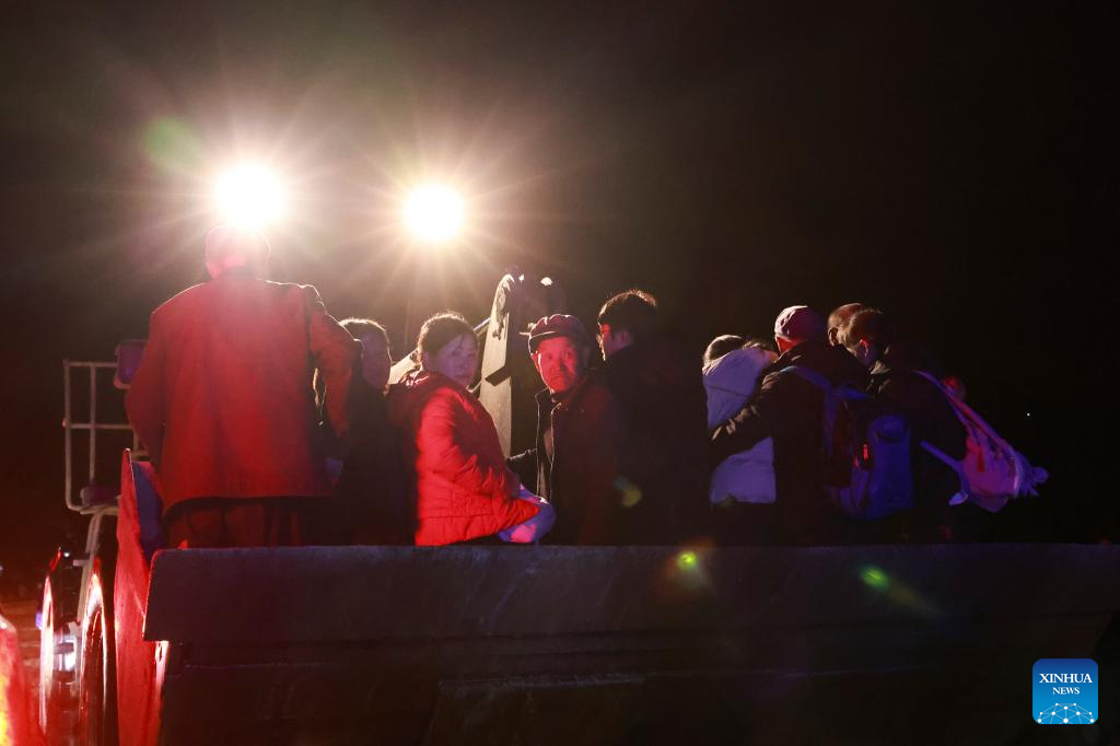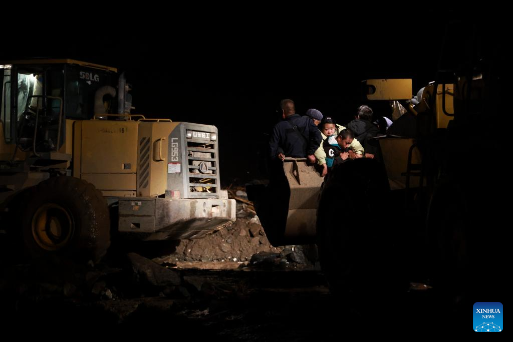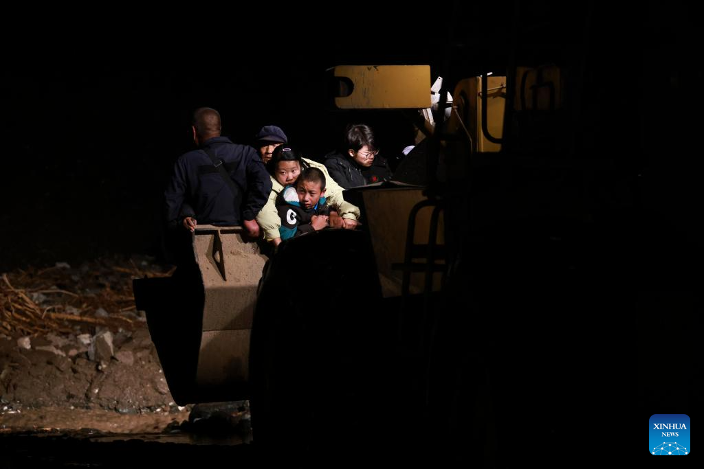 Affected residents are evacuated by a loader at Maliantan Village in Yuzhong County of northwest China's Gansu Province on Aug. 8, 2025. Rescue efforts are underway after continuous heavy rainfall triggered mountain torrents in Yuzhong County.