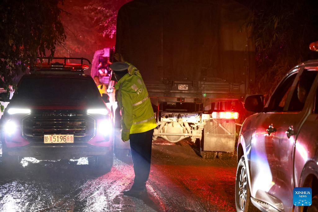 A policeman directs traffics for emergency vehicles at Maliantan Village in Yuzhong County of northwest China's Gansu Province on Aug. 8, 2025. Rescue efforts are underway after continuous heavy rainfall triggered mountain torrents in Yuzhong County.