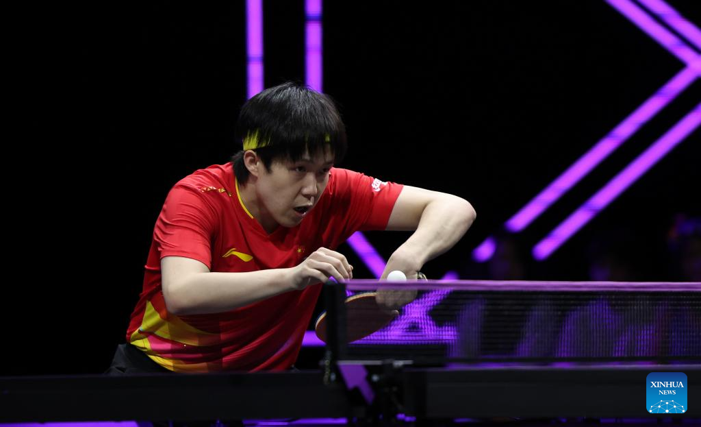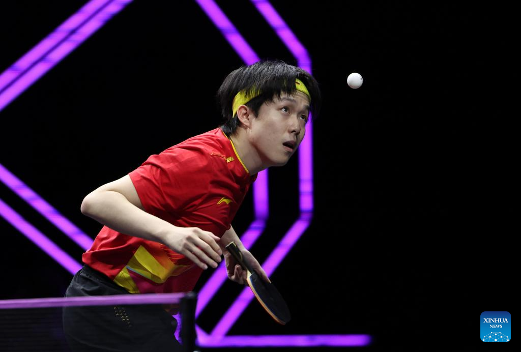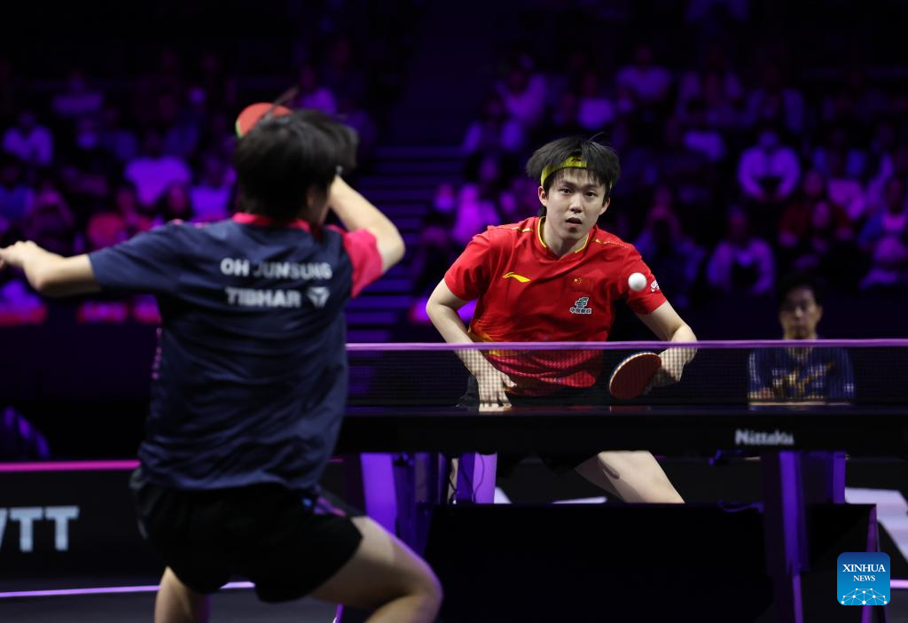 Wang Chuqin of China hits a return during the men's singles round of 16 match against Oh Junsung of South Korea at the WTT Champions Yokohama 2025 in Yokohama, Japan, Aug. 9, 2025. (Xinhua/Yue Chenxing)