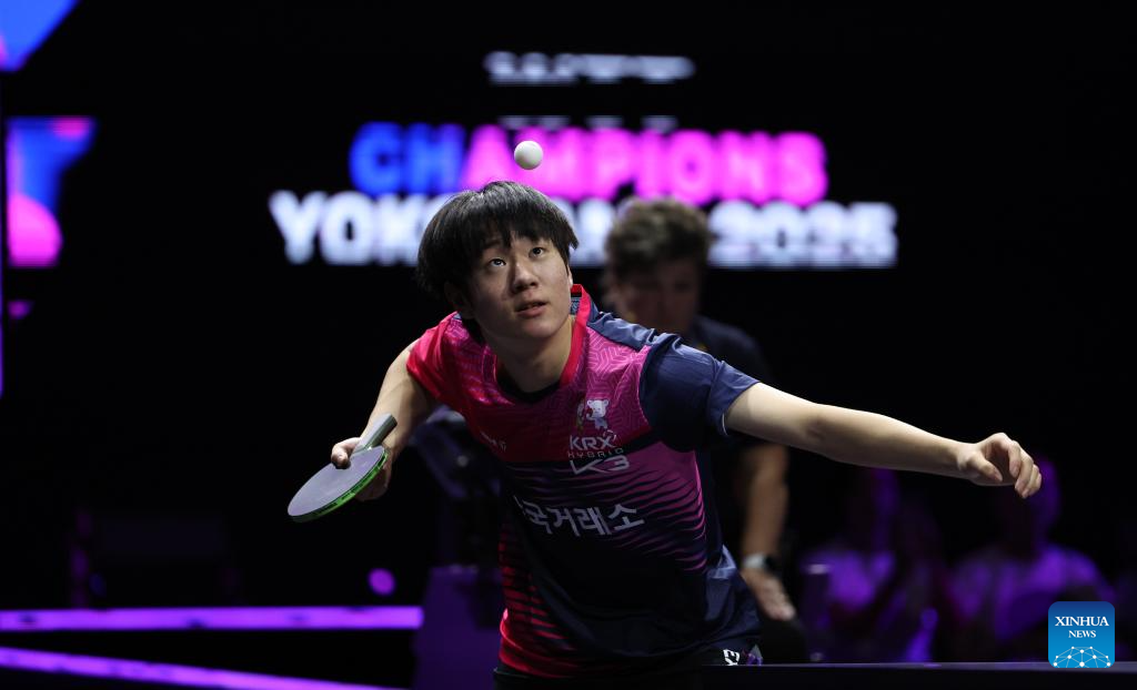 Oh Junsung of South Korea serves during the men's singles round of 16 match against Wang Chuqin of China at the WTT Champions Yokohama 2025 in Yokohama, Japan, Aug. 9, 2025. (Xinhua/Yue Chenxing)