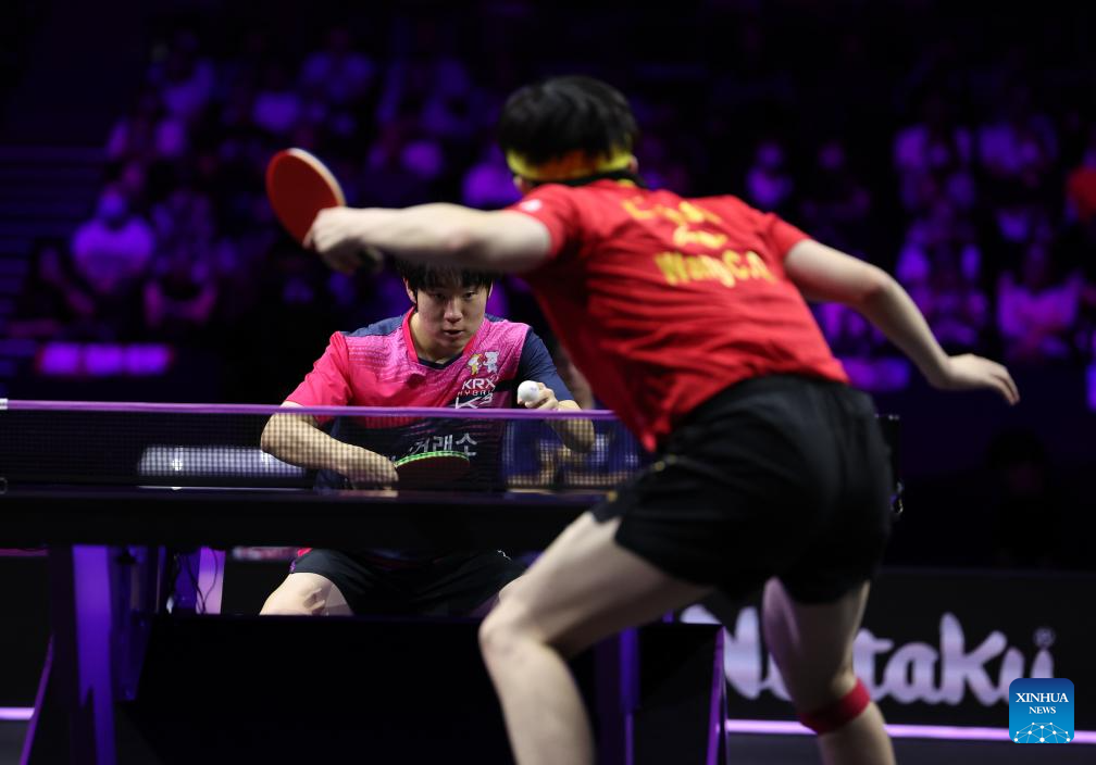 Oh Junsung (L) of South Korea hits a return during the men's singles round of 16 match against Wang Chuqin of China at the WTT Champions Yokohama 2025 in Yokohama, Japan, Aug. 9, 2025. (Xinhua/Yue Chenxing)