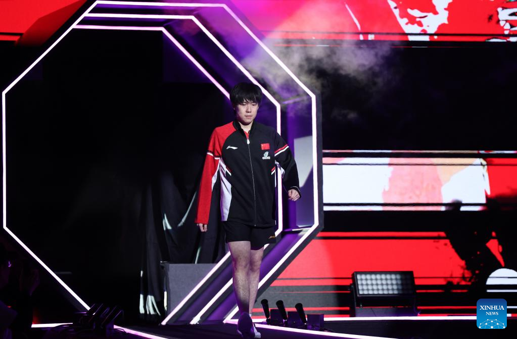 Wang Chuqin of China enters the court before the men's singles round of 16 match against Oh Junsung of South Korea at the WTT Champions Yokohama 2025 in Yokohama, Japan, Aug. 9, 2025. (Xinhua/Yue Chenxing)