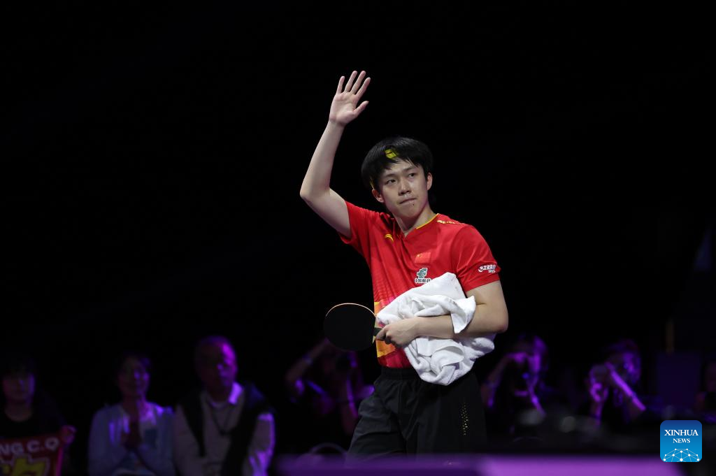 Wang Chuqin of China greets the spectators after the men's singles round of 16 match against Oh Junsung of South Korea at the WTT Champions Yokohama 2025 in Yokohama, Japan, Aug. 9, 2025. (Xinhua/Yue Chenxing)
