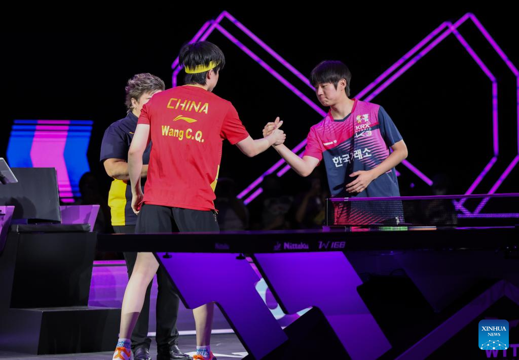 Wang Chuqin (front L) of China and Oh Junsung (R) of South Korea greet each other before their men's singles round of 16 match at the WTT Champions Yokohama 2025 in Yokohama, Japan, Aug. 9, 2025. (Xinhua/Yue Chenxing)