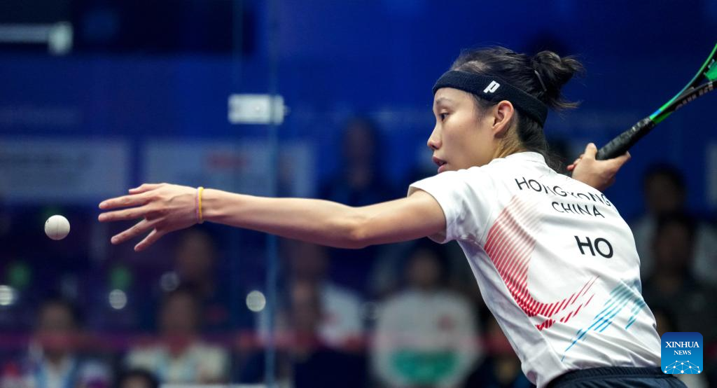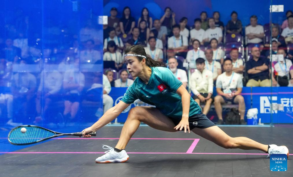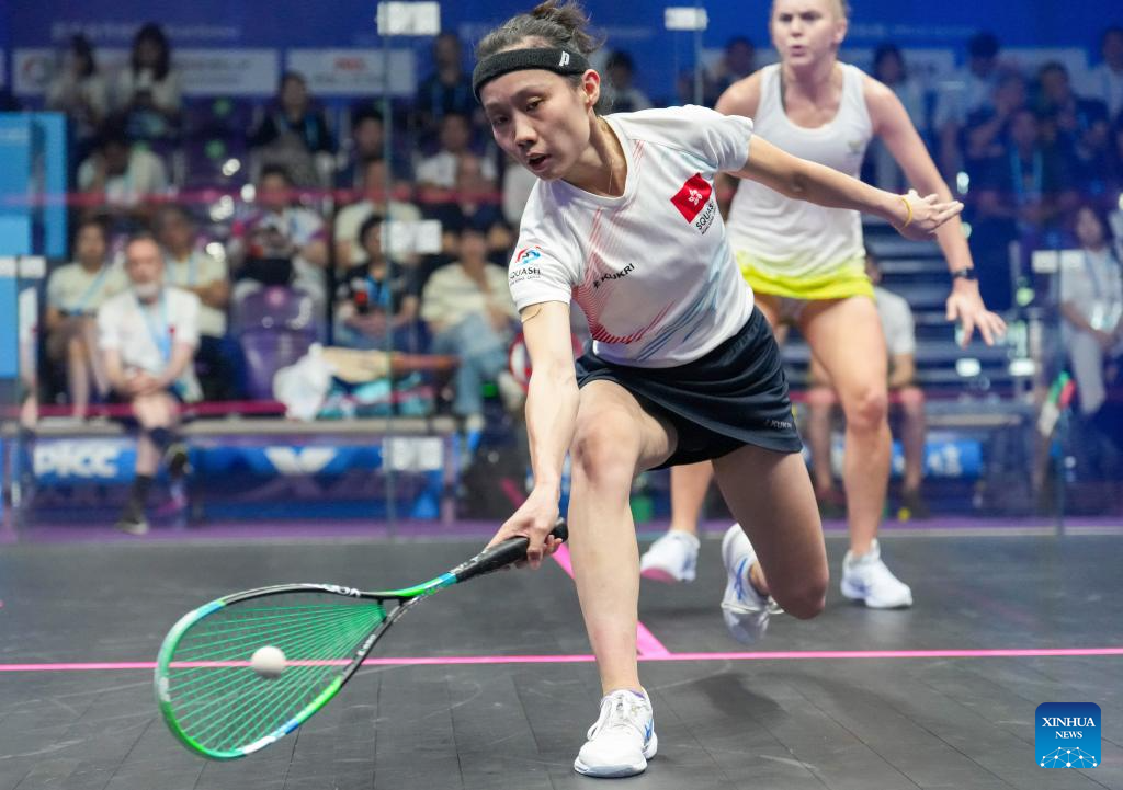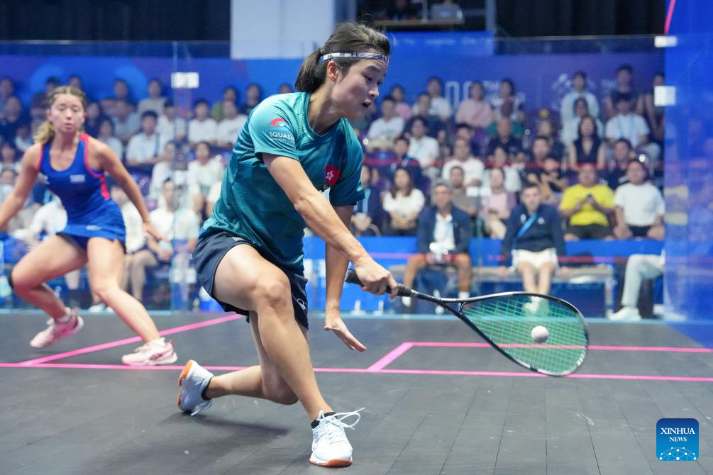 Lee Ka Yi of China's Hong Kong competes during the Squash event women's singles round of 16 match between Lee Ka Yi of China's Hong Kong and Kara Lincou of France at The World Games 2025 in Chengdu, southwest China's Sichuan Province, Aug. 9, 2025. (Xinhua/Li Xulun)