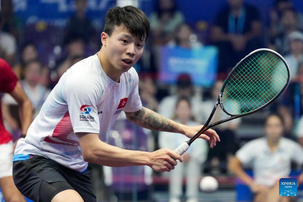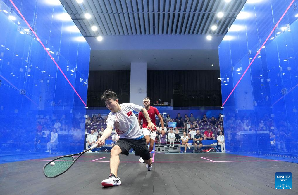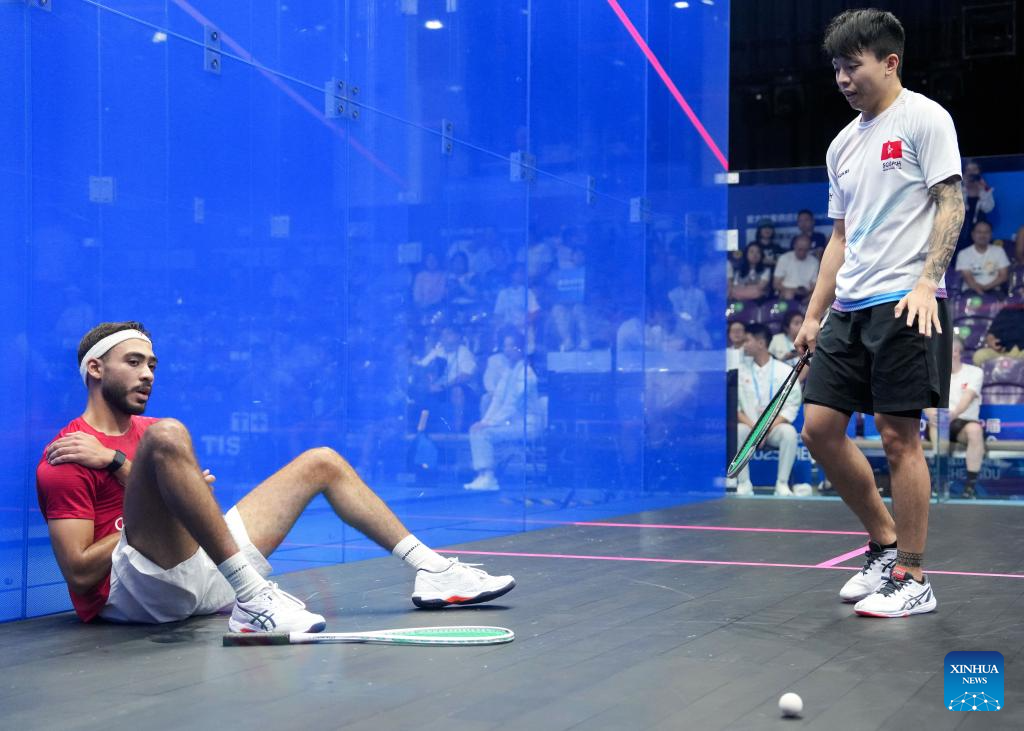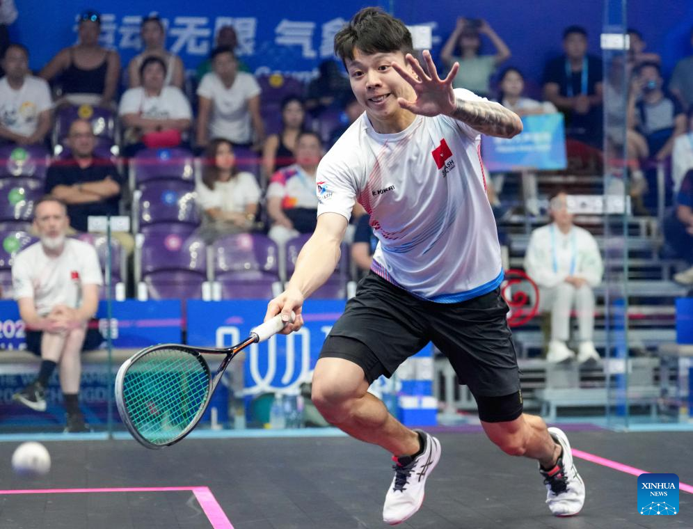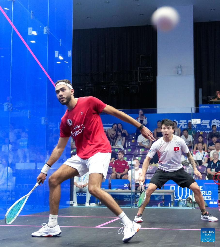 Lau Tse Kwan of China's Hong Kong competes during the Squash event men's singles round of 16 match against Mohamed Nasser of Egypt at The World Games 2025 in Chengdu, southwest China's Sichuan Province, Aug. 9, 2025. (Xinhua/Li Xulun)