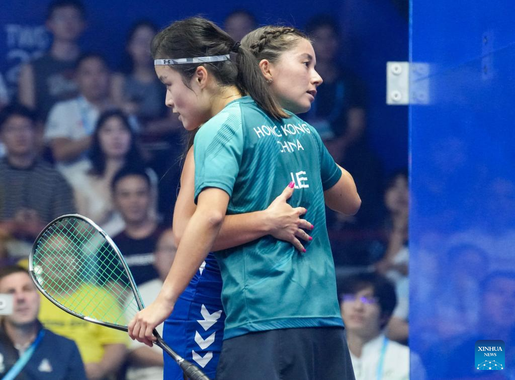 Lee Ka Yi (front) of China's Hong Kong hugs Kara Lincou of France after the Squash event women's singles round of 16 match between Lee Ka Yi of China's Hong Kong and Kara Lincou of France at The World Games 2025 in Chengdu, southwest China's Sichuan Province, Aug. 9, 2025. (Xinhua/Li Xulun)