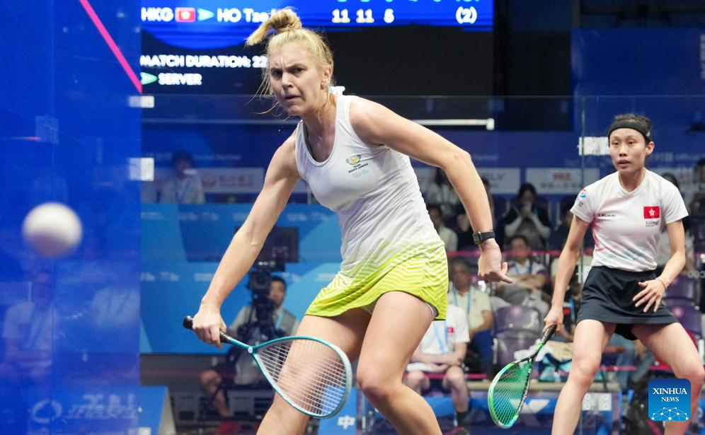 Ho Tze Lok (R) of China's Hong Kong competes during the Squash event women's singles round of 16 match against Hayley Ward of South Africa at The World Games 2025 in Chengdu, southwest China's Sichuan Province, Aug. 9, 2025. (Xinhua/Li Xulun)