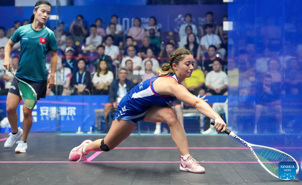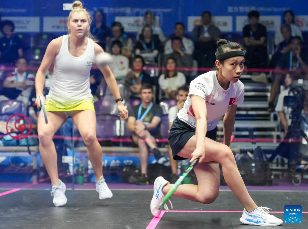 Lee Ka Yi (R) of China's Hong Kong competes during the Squash event women's singles round of 16 match between Lee Ka Yi of China's Hong Kong and Kara Lincou of France at The World Games 2025 in Chengdu, southwest China's Sichuan Province, Aug. 9, 2025. (Xinhua/Li Xulun)