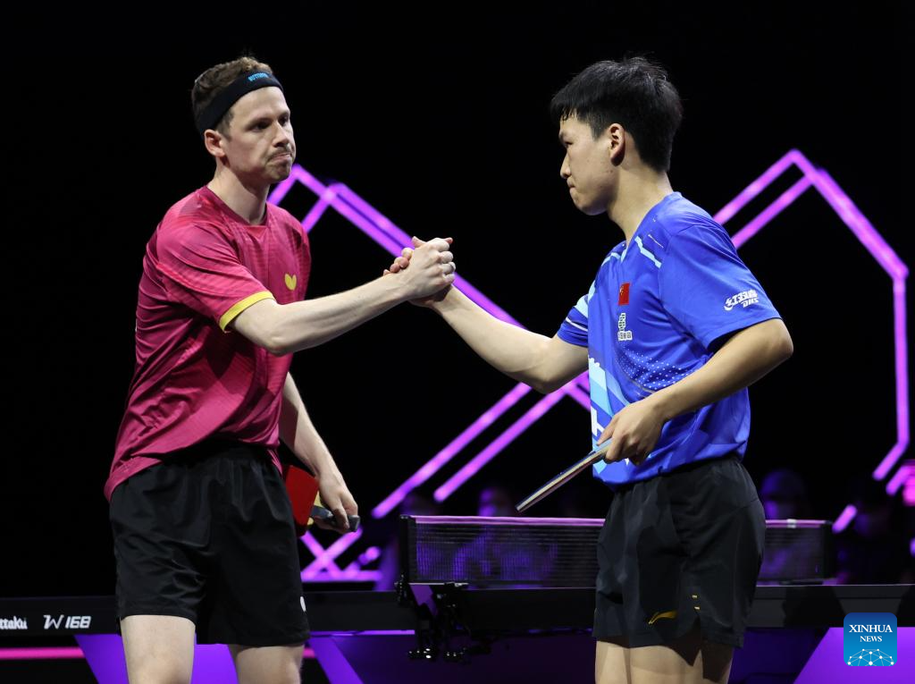 Xiang Peng (R) of China and Jonathan Groth of Denmark shake hands after the men's singles round of 16 match at the WTT Champions Yokohama 2025 in Yokohama, Japan, Aug. 9, 2025. (Xinhua/Yue Chenxing)