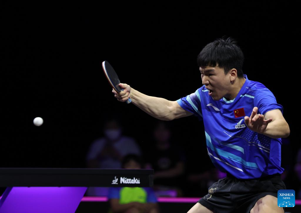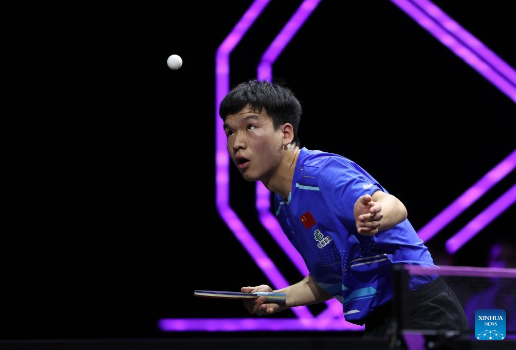 Xiang Peng of China hits a return during the men's singles round of 16 match against Jonathan Groth of Denmark at the WTT Champions Yokohama 2025 in Yokohama, Japan, Aug. 9, 2025. (Xinhua/Yue Chenxing)