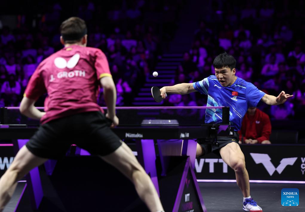Xiang Peng (R) of China hits a return during the men's singles round of 16 match against Jonathan Groth of Denmark at the WTT Champions Yokohama 2025 in Yokohama, Japan, Aug. 9, 2025. (Xinhua/Yue Chenxing)
