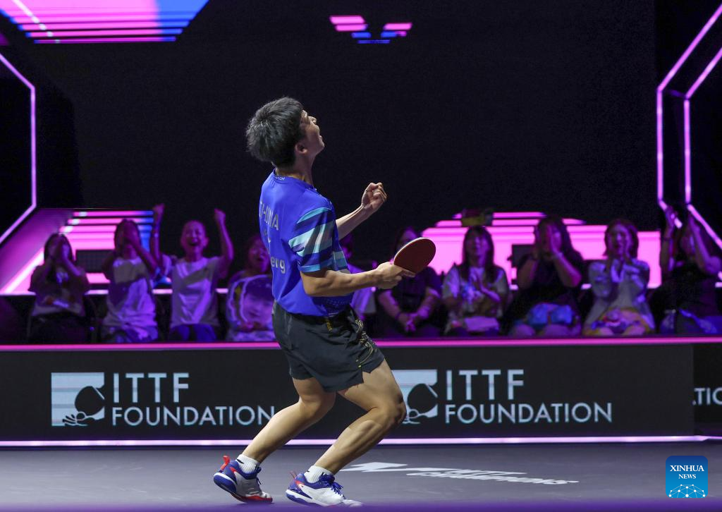 Xiang Peng of China celebrates during the men's singles round of 16 match against Jonathan Groth of Denmark at the WTT Champions Yokohama 2025 in Yokohama, Japan, Aug. 9, 2025. (Xinhua/Yue Chenxing)