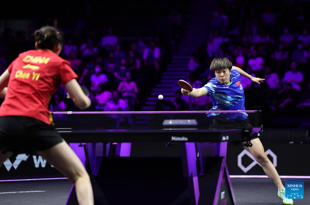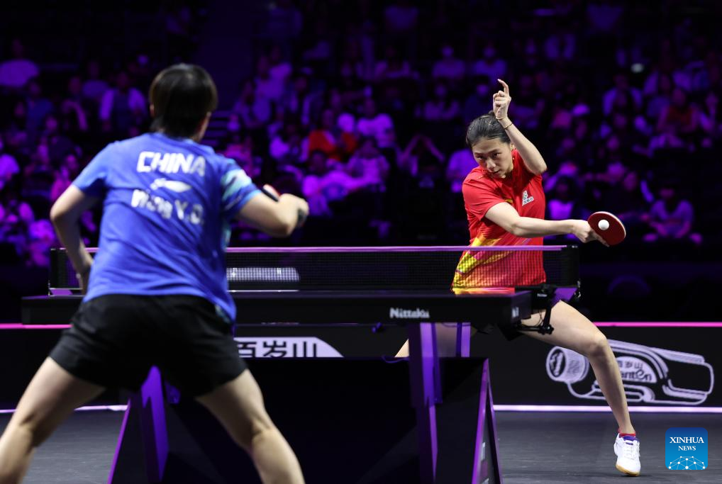 Wang Yidi (R) of China hits a return during the women's singles quarterfinal match against Chen Yi of China at the WTT Champions Yokohama 2025 in Yokohama, Japan, Aug. 10, 2025. (Xinhua/Yue Chenxing)
