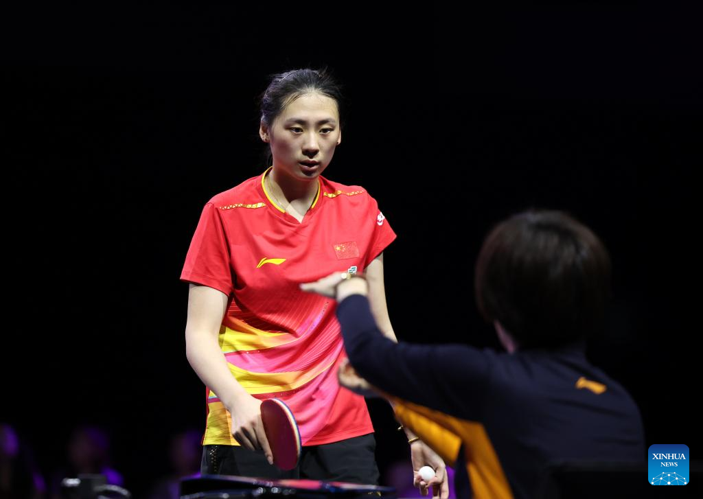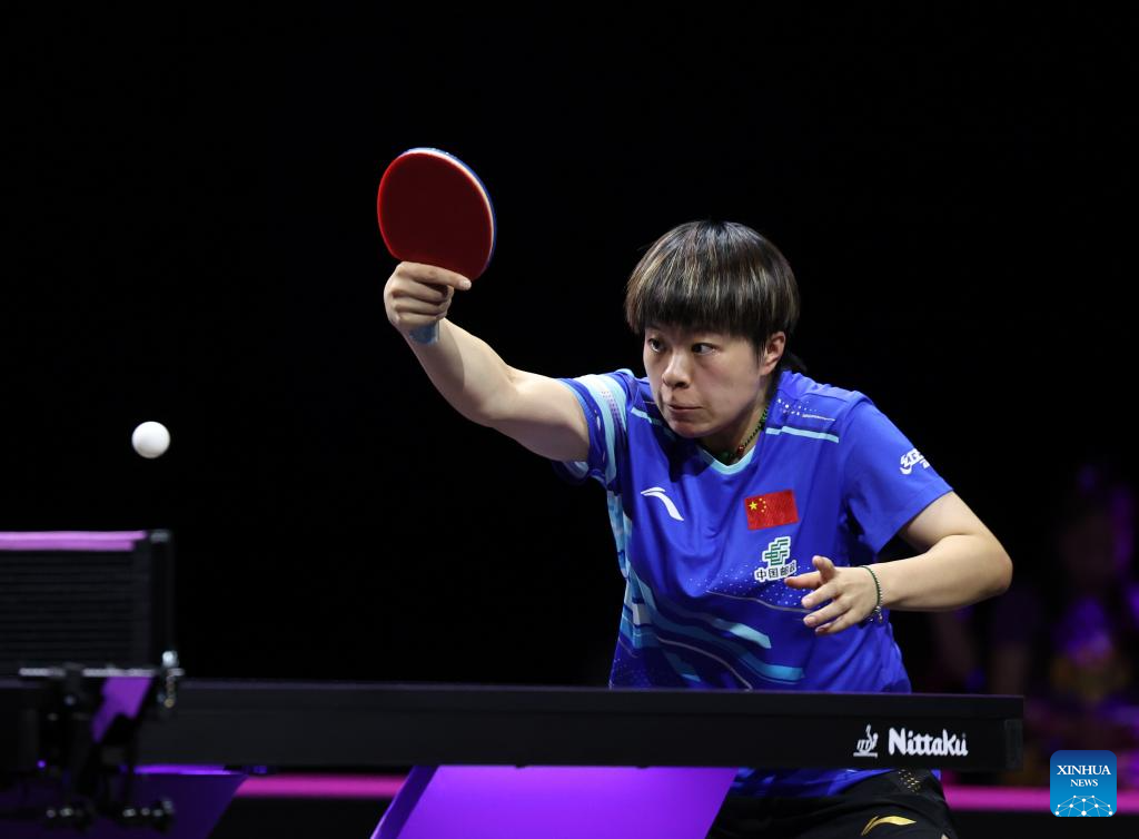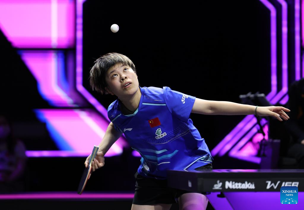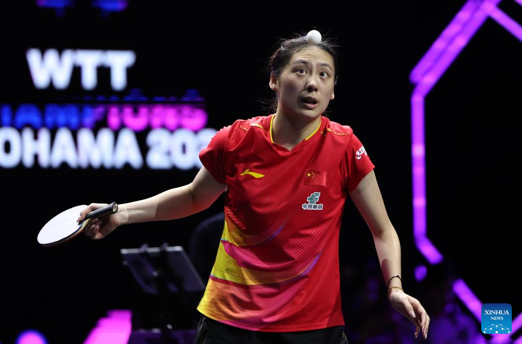 Wang Yidi of China hits a return during the women's singles quarterfinal match against Chen Yi of China at the WTT Champions Yokohama 2025 in Yokohama, Japan, Aug. 10, 2025. (Xinhua/Yue Chenxing)