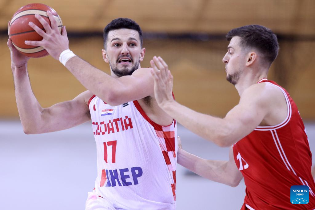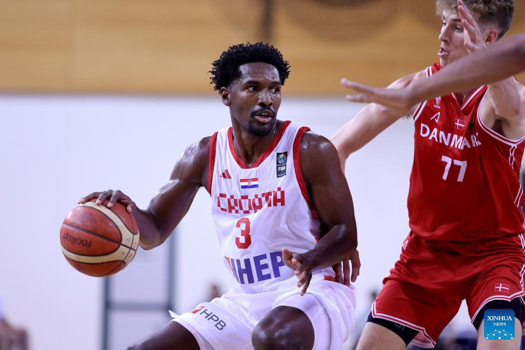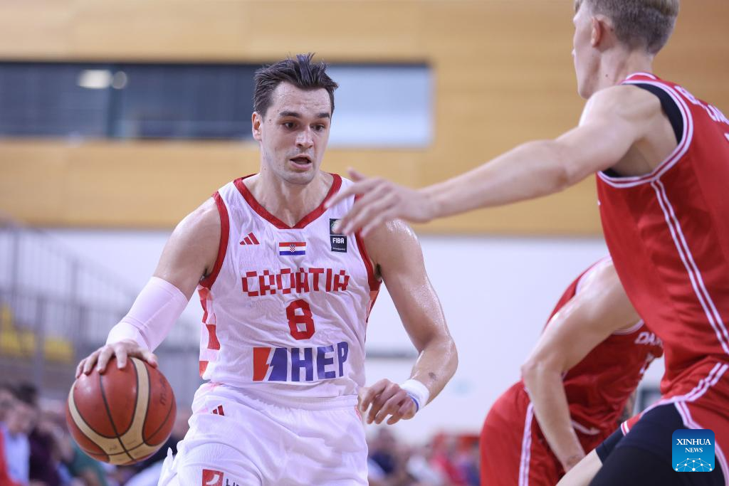 Mario Hezonja (L) of Croatia controls the ball during the FIBA Basketball World Cup 2027 European Pre-Qualifiers group G Round 2 match between Croatia and Denmark in Opatija, Croatia, on Aug. 9, 2025. (Photo by Nel Pavletic/PIXSELL via Xinhua)