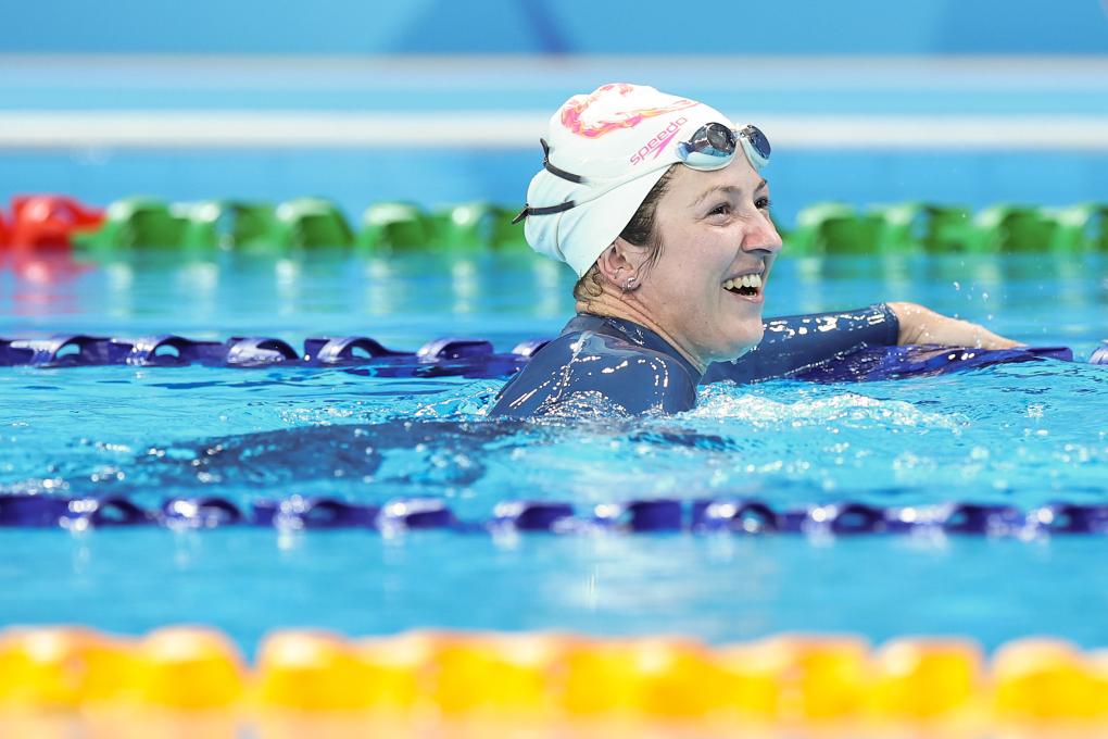 Julia Malgorzata Kozerska of Poland reacts after setting a new world record in the Women's Dynamic without Fins Final of the Freediving event at The World Games 2025 in Chengdu, southwest China's Sichuan Province, Aug. 10, 2025. (Xinhua/Zhang Liyun)