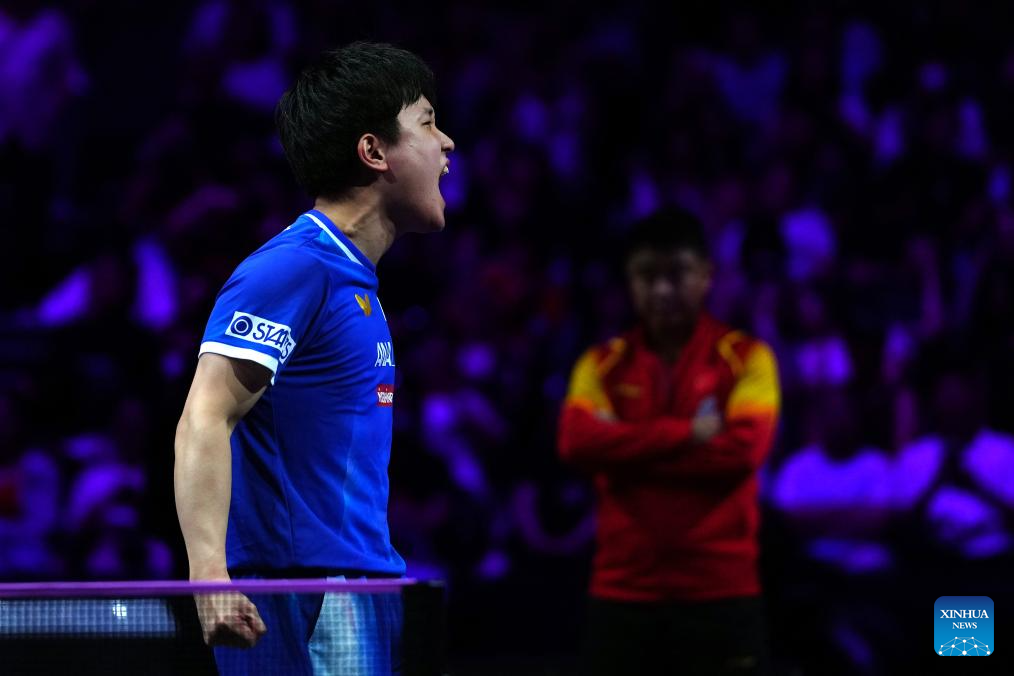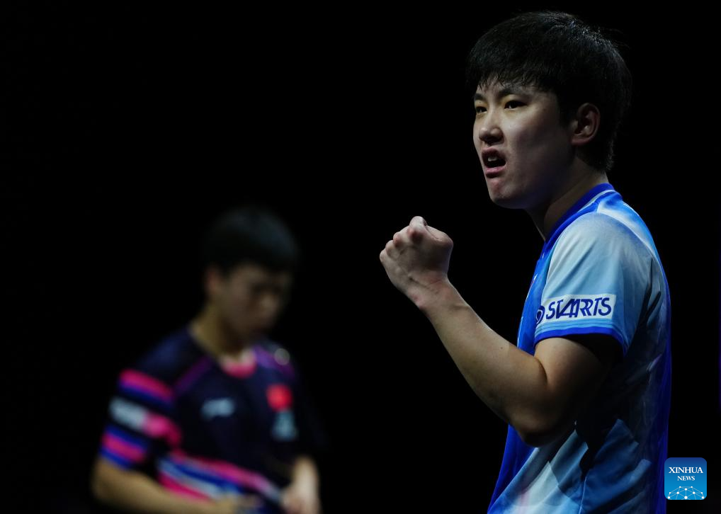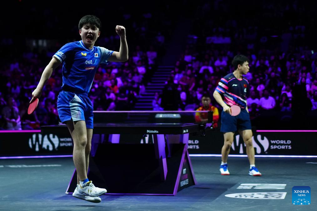 Xiang Peng (R) reacts during the men's singles quarterfinal between Xiang Peng of China and Harimoto Tomokazu of Japan at the WTT Champions Yokohama 2025 in Yokohama, Japan, Aug. 10, 2025. (Xinhua/Jia Haocheng)