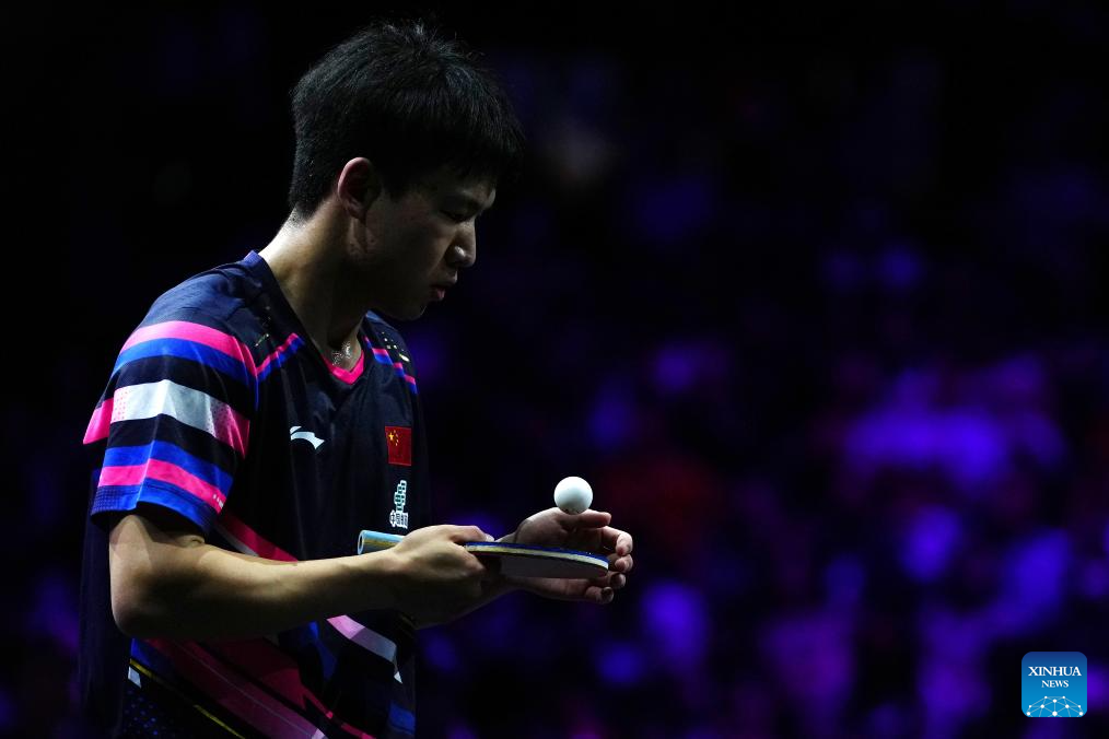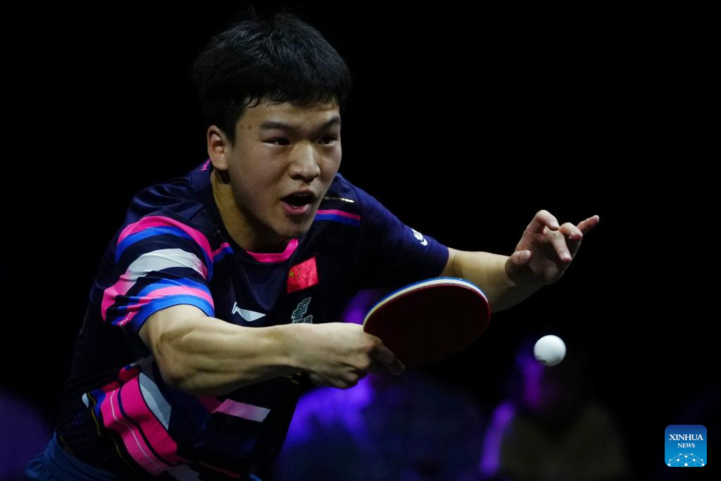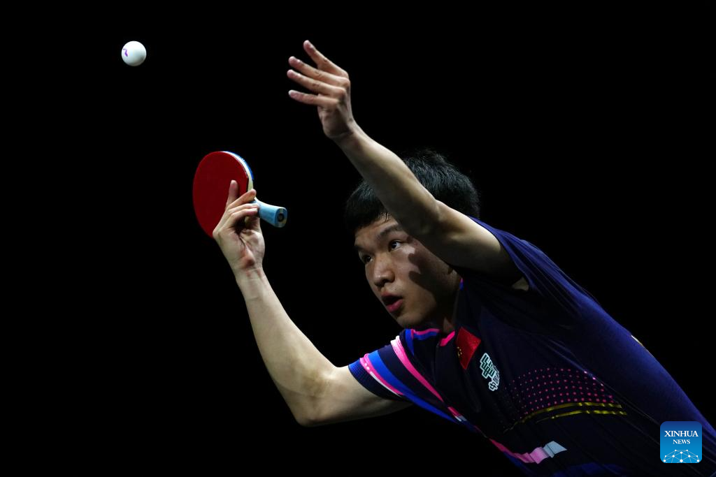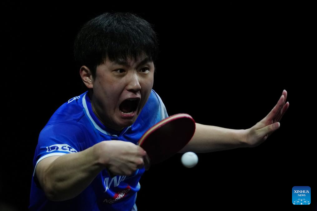 Xiang Peng hits a return during the men's singles quarterfinal between Xiang Peng of China and Harimoto Tomokazu of Japan at the WTT Champions Yokohama 2025 in Yokohama, Japan, Aug. 10, 2025. (Xinhua/Jia Haocheng)