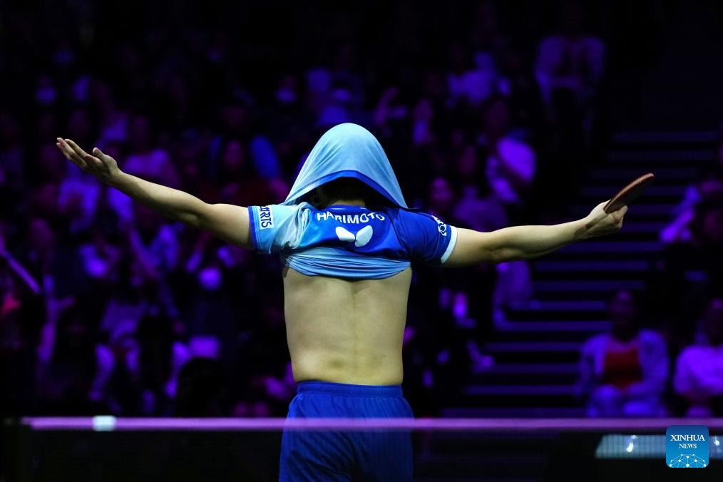 Harimoto Tomokazu celebrates winning the men's singles quarterfinal between Xiang Peng of China and Harimoto Tomokazu of Japan at the WTT Champions Yokohama 2025 in Yokohama, Japan, Aug. 10, 2025. (Xinhua/Jia Haocheng)