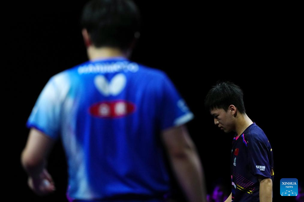 Xiang Peng (R) hits a return during the men's singles quarterfinal between Xiang Peng of China and Harimoto Tomokazu of Japan at the WTT Champions Yokohama 2025 in Yokohama, Japan, Aug. 10, 2025. (Xinhua/Jia Haocheng)