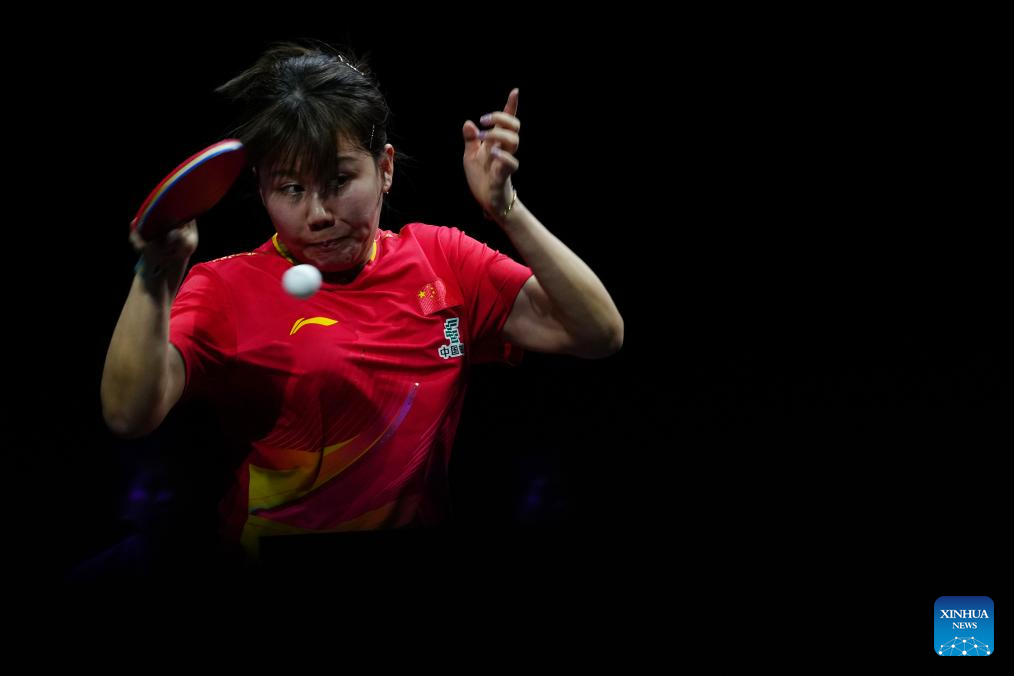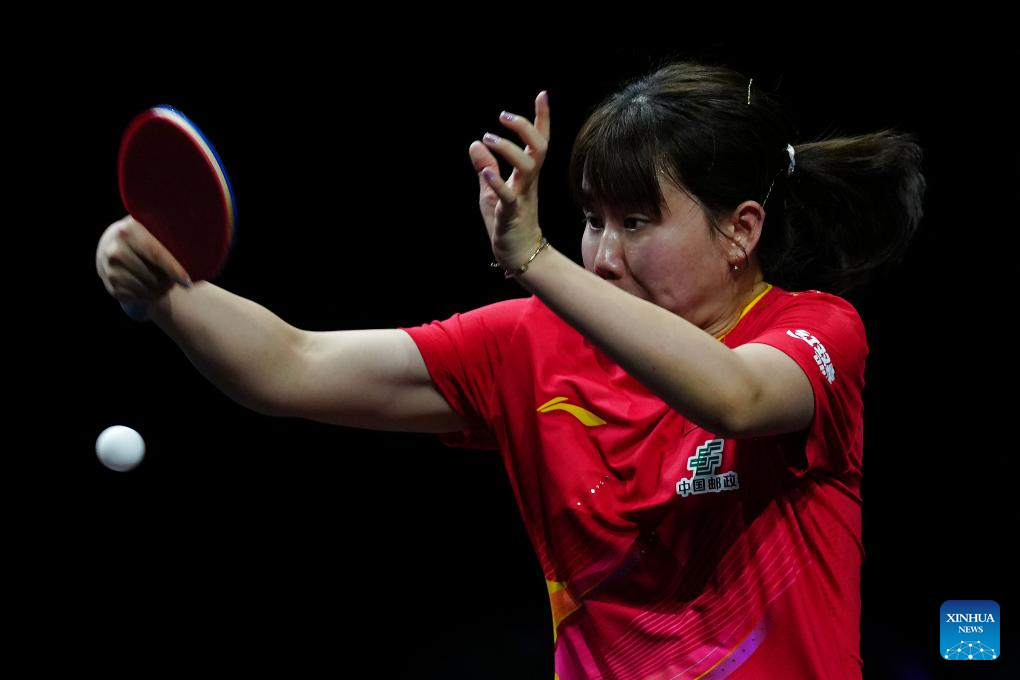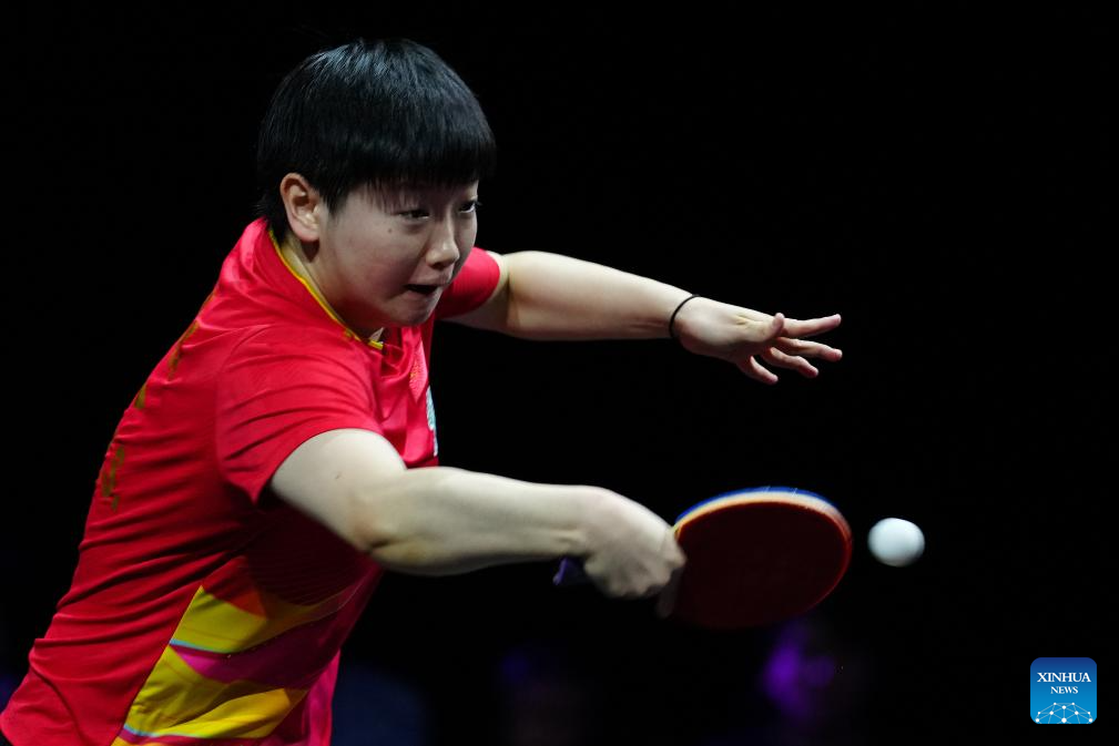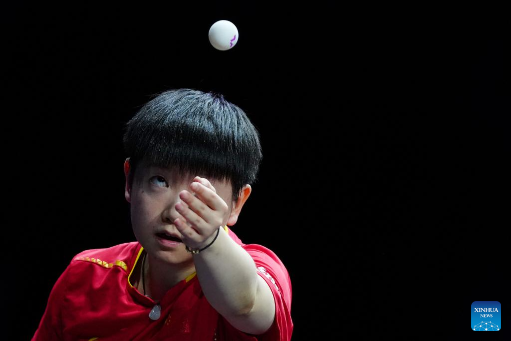 Chen Xingtong hits a return during the women's singles quarterfinal between Chen Xingtong of China and Hayata Hina of Japan at the WTT Champions Yokohama 2025 in Yokohama, Japan, Aug. 10, 2025. (Xinhua/Jia Haocheng)