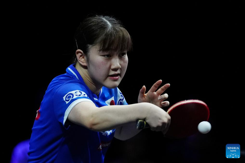Hayata Hina hits a return during the women's singles quarterfinal between Chen Xingtong of China and Hayata Hina of Japan at the WTT Champions Yokohama 2025 in Yokohama, Japan, Aug. 10, 2025. (Xinhua/Jia Haocheng)