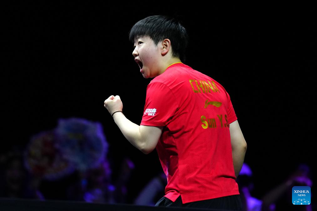 Sun Yingsha celebrates scoring during the women's singles quarterfinal between Sun Yingsha of China and Odo Satsuki of Japan at the WTT Champions Yokohama 2025 in Yokohama, Japan, Aug. 10, 2025. (Xinhua/Jia Haocheng)